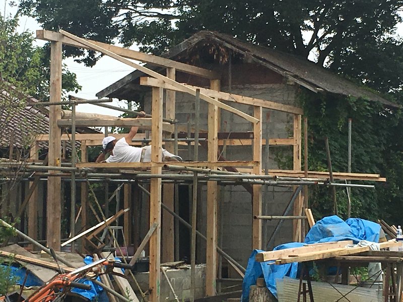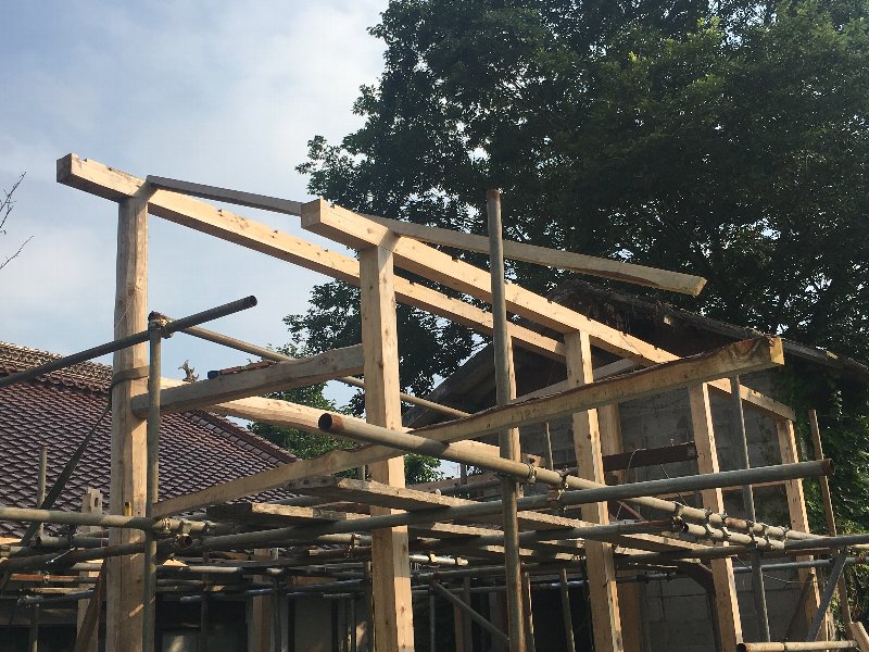 ただ今、第三ステージ、ピザ釜小屋の「柱」と「梁」の組み立てが終わり、