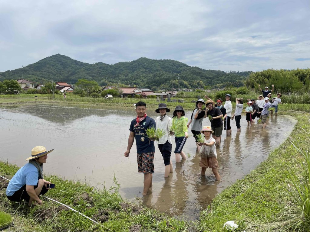 6/4は、当農園のお客様・スタッフ、こども食堂(夕焼けぽっぽ食堂)、広島大学の先生、地域の方、皆さまにお手伝いいただき、手植え&機械植えを行いました。