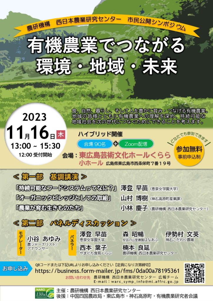 11月16日(木曜)に東広島市で農研機構西日本農業研究センターさん主催の市民公開シンポジウムが開催されます。