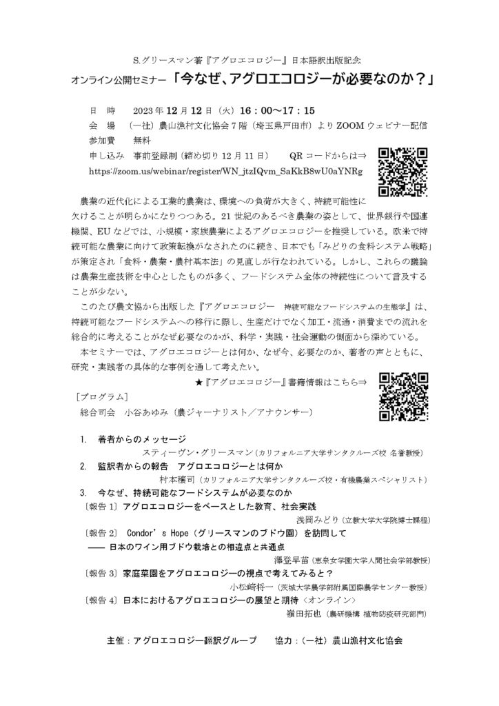 【12/12】『アグロエコロジー』日本語訳出版記念 オンライン公開セミナーを開催します