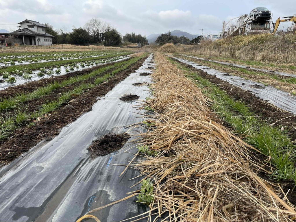 エンドウの畝では、ポリマルチの半分程度に敷き草。