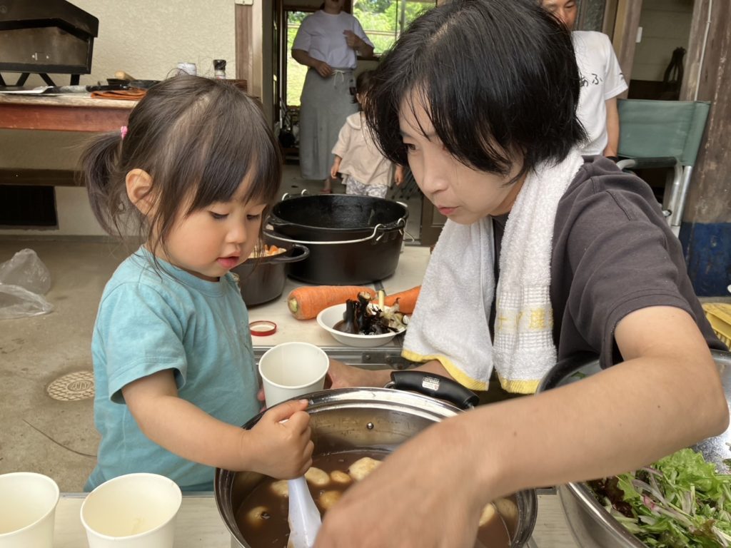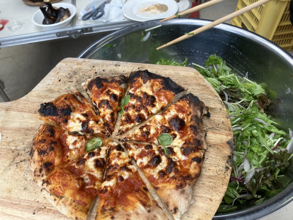 植え付け後は、みんなで美味しい手作りのご馳走(ピザ、焼きそば、豆おむすび、鉄板焼きいろいろ、サラダ、焼き野菜、ケーキ、スイカ、ポトフ、おしるこ、ドーナツ)をいただき、歴史資料館の見学、五右衛門ぶろ、生き物探し、野菜収穫体験、食・農業の情報交換など思い思いに過ごしました。