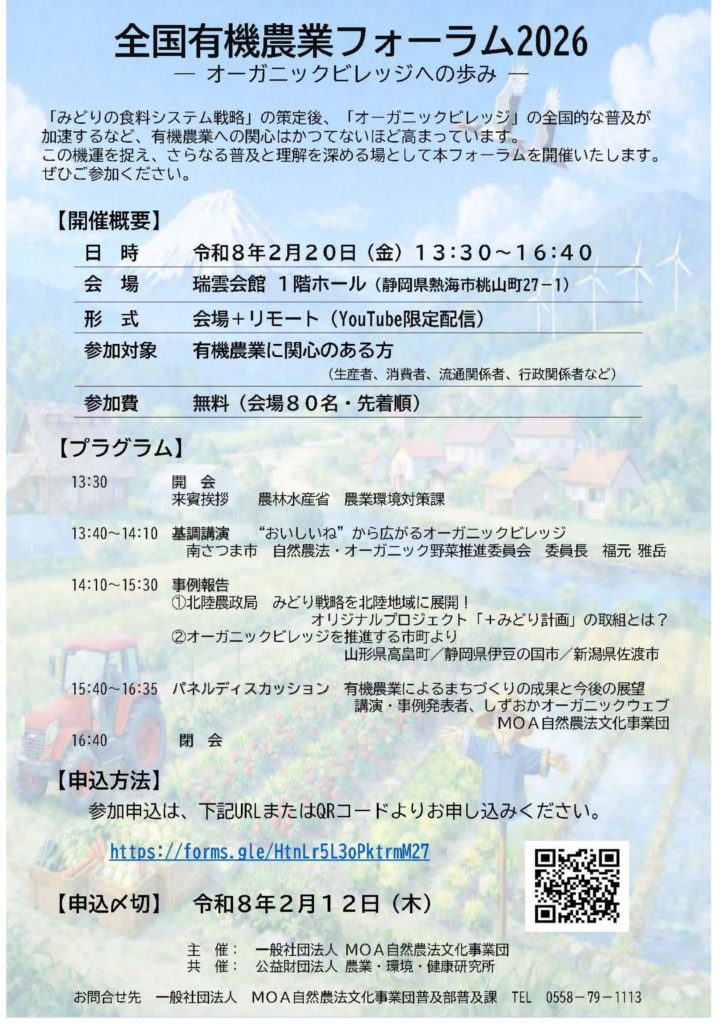 内容 :(一社)MOA自然農法文化事業団は、(公財)農業・環境・健康研究所と共催で、有機農業のさらなる普及と理解を深める場として、「オーガニックビレッジへの歩み」をテーマに『全国有機農業フォーラム2026』を開催。基調講演をはじめ、各地域の事例報告、「有機農業によるまちづくりの成果と今後の展望」をテーマにパネルディスカッションを行う。定員、会場80名(先着順)。参加費無料。2月12日(木)締切。