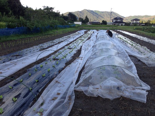 雨の前に植えたキャベツ・ハクサイ・ブロッコリーカリフラワーを覆う防虫ネットも飛散。